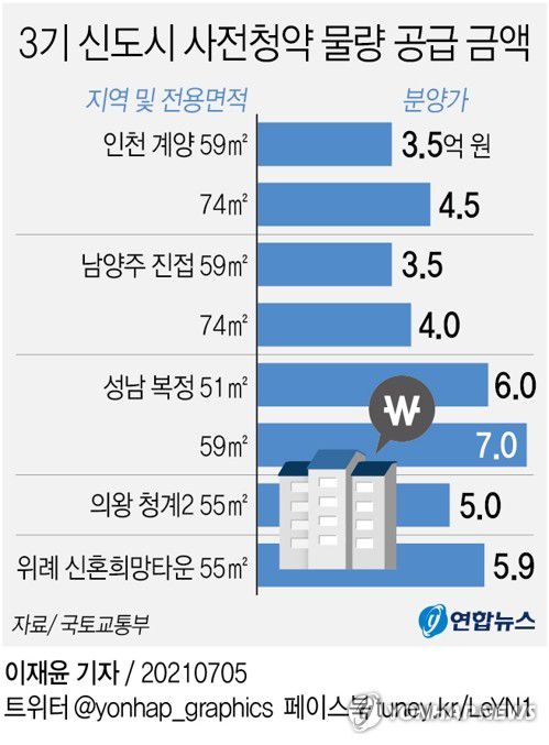성남 복정은 51㎡는 6억원, 59㎡은 7억원에, 의왕 청계2는 55㎡가 5억원에, 위례 신혼희망타운은 55㎡이 5억9천만원에 공급될 예정이다.