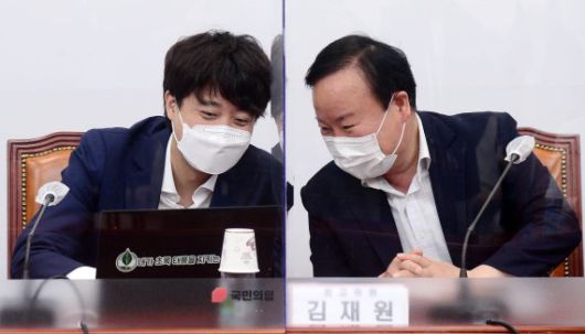 이준석 국민의힘 대표가 5일 서울 여의도 국회에서 열린 최고위원회의에서 김재원 최고위원과 대화를 하고 있다. 2021.7.5/뉴스1 © News1 이동해 기자 /사진=뉴스1 |