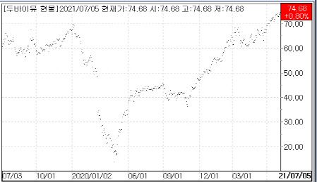 6일 한국은행과 한국석유공사 등에 따르면 지난 3∼5월 두바이유 평균 가격은 배럴당 64달러로 직전 3개월보다 16%나 올랐다. 월별로 봐도 지난 4월까지 62.37달러에 그쳤던 두바이유 현물 가격은 6월 들어 평균 70.96달러로, 70달러 위로 올라섰다. 이달 들어서는 6일까지 평균 가격도 74.23달러로 더 높아졌다.