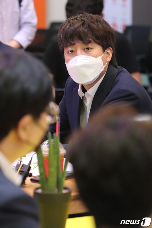 (대구=뉴스1) 공정식 기자 = 이준석 국민의힘 대표(왼쪽)가 7일 오전 대구삼성창조캠퍼스에서 열린 청년창업자 간담회에서 청년창업자들과 이야기 나누고 있다. 2021.7.7/뉴스1jsgong[© 뉴스1코리아(news1.kr), 무단 전재 및 재배포 금지]