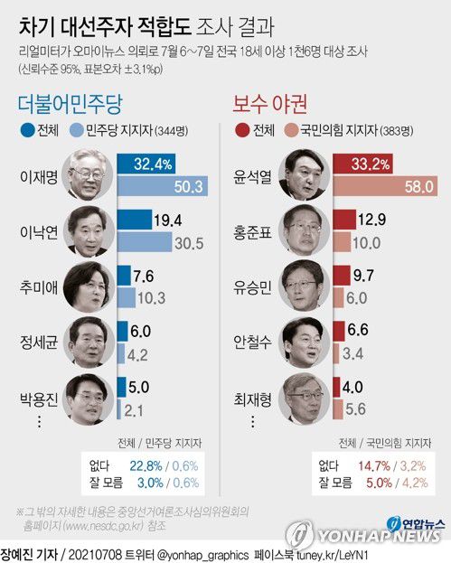 (서울=연합뉴스) 김동호 기자 = 차기 대권 지지율에서 여권은 이재명 경기지사가, 야권에선 윤석열 전 검찰총장이 각각 선두를 유지하고 있다는 여론조사 결과가 8일 나왔다.