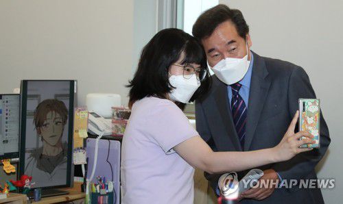 (서울=연합뉴스) 더불어민주당 이낙연 전 대표가 8일 오전 서울 마포구 서교동 키다리 스튜디오에서 열린 웹툰·웹소설 업계 현장 간담회에 앞서 봄툰 공작소 직원들과 기념사진을 찍고 있다. 2021.7.8 [국회사진기자단] toadboy@yna.co.kr <저작권자(c)연합뉴스. 무단전재-재배포금지.>