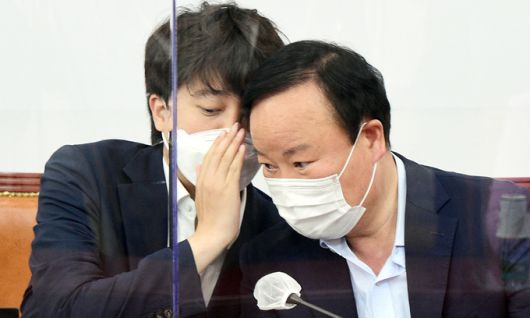 국민의힘 이준석 대표(왼쪽)와 김재원 최고위원이 8일 서울 여의도 국회에서 열린 당 최고위원회의에서 귓속말을 주고받고 있다. 서상배 선임기자 |