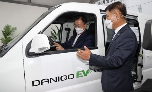 문 대통령은 전시회 관람 도중 ‘다니고 밴’에 대한 설명을 듣고 탑승도 했다. LG에너지솔루션 배터리가 탑재된 이 차량은 ‘군산형 일자리’를 통해 제작된 소형 전기 화물차다. 문 대통령이 지난달 24일 ‘다니고 밴’ 1호차 출고 축하글을 직접 사회관계망서비스(SNS)에 올리기도 했다.