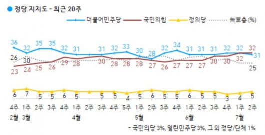 국민의힘 지지율은 지난주와 동일한 32%로 2016년 국정농단 사태 본격화 이후 최고치를 유지했다. 반면, 민주당 지지율은 전주보다 1%p 떨어져 정당 지지도 1위 자리를 국민의 힘에 내줬다.