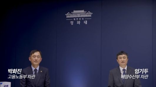 박화진 고용노동부 차관과 엄기두 해양수산부 차관이 9일 평택항 컨테이너 사고로 숨진 故 이선호 씨 사고에 대한 국민청원에 답하고 있다. /청와대 유튜브 갈무리 |