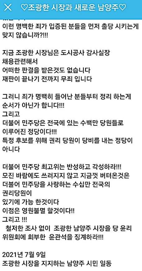이들은 이날 자신들의 온라인 카페에 글을 올려 "남양주도시공사 감사실장 채용에 관여한 혐의에 대해 뇌물과 불법 정치자금 수수 등을 다룬 당헌을 근거로 당직을 정지했다"며 "조 시장이 뇌물 받은 것이 아닌데다 관여 혐의는 아직 재판 중인데 이 같은 조치가 납득되지 않는다"고 비판했다.