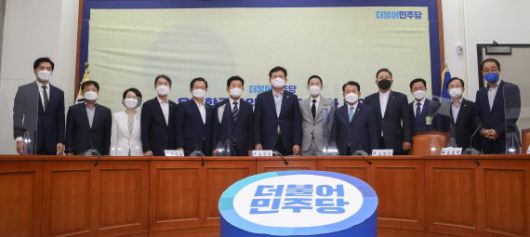 9일 오전 서울 여의도 국회에서 열린 더불어민주당 우주항공방위산업TF 1차 회의에서 송영길 대표, 김병주 TF 단장, 용홍택 과학기술정보통신부 차관 등 참석자들이 기념촬영하고 있다. 사진=공동취재단 |