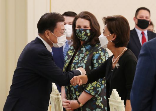 문재인 대통령이 9일 청와대 본관에서 미 의회 코리아스터디 그룹(CSGK) 대표단을 접견하며 CSGK 공동의장인 영 킴 의원과 인사하고 있다. [연합] |