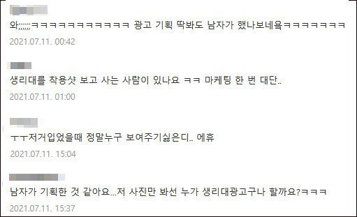 사진을 본 누리꾼들은 “살다살다 생리대 착용샷은 처음본다” “광고 사진으로 사용할 것이 있고, 아닌 게 있지 않느냐” “민망하네” 등 비판했다. 반면 “속옷 광고 이미지랑 뭐가 다르냐” “이걸 성적으로 보는 게 더 이상함” 등의 의견도 있었다.