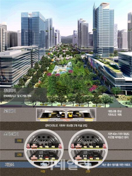 서초구의 ‘경부간선도로 지하화 마스터플랜’에 따르면 경부고속도로 한남IC~양재IC 구간(6.4㎞)구간을 지하화, 상·하행선을 복층 구조로 건설해 12차로를 확보한다. 이어 지상에는 공원과 주거·상업지역 등으로 개발한다.