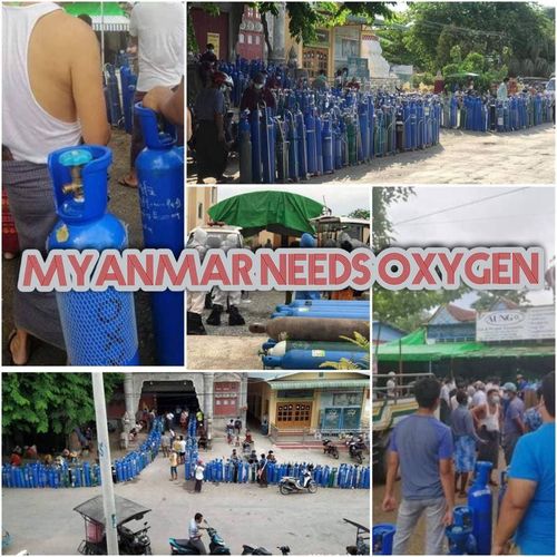 한 네티즌은 전날 양곤시 남다곤 타운십(구)에서 통행금지 직전임에도 시민들이 산소통에 산소를 채우기 위해 늘어서 있다는 설명과 함께 사진을 올렸다.