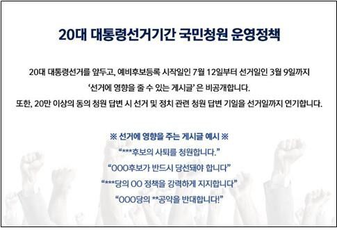 이에 따라 해당 기간 "***후보의 사퇴를 청원합니다", "OOO 후보가 반드시 당선돼야 합니다", "***당의 OO 정책을 강력하게 지지합니다" 등 특정 후보나 정당을 지지하거나 비방해 선거에 영향을 줄 수 있는 국민청원은 비공개한다.