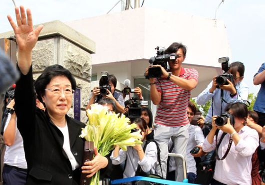 2015년 8월 24일 한명숙 전 국무총리가 서울구치소에 수감되기 직전 지지자들에게 인사하고 있다. 중앙포토 |