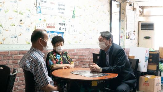[서울=뉴스핌] 김태훈 기자 = 윤석열 전 검찰총장이 12일 서울 용산구의 한 식당에서 식당 부부와 대화를 나누고 있다. [사진=윤석열 캠프 제공] 2021.07.12 taehun02@newspim.com |
