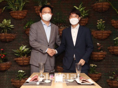 더불어민주당 송영길(왼쪽) 대표와 국민의힘 이준석 대표가 12일 서울 여의도의 한 식당에서 만찬 회동을 하고 있다.(사진=국회사진취재단) |