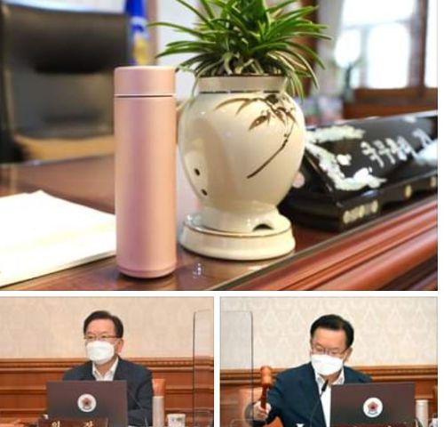 김부겸 국무총리가 13일 오전에 열린 국무회의에 핑크 텀블러를 앞에 두고 회의를 진행하는 모습./사진=김부겸 국무총리 페이스북 캡쳐 |