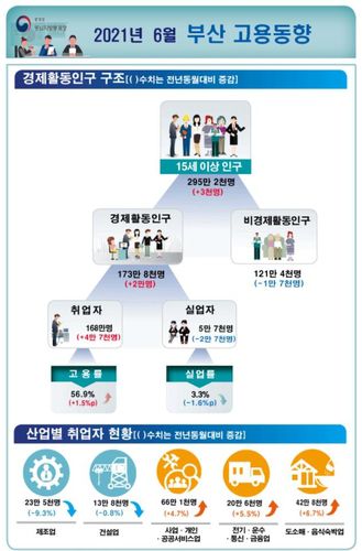 동남지방통계청이 14일 발표한 6월 부산시 고용동향을 보면 취업자는 168만명으로 지난해 같은 달 대비 4만7천명(2.9%) 증가했다.