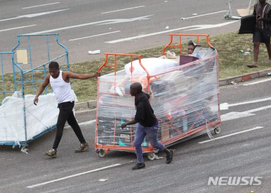 [더반=AP/뉴시스] 지난 12일(현지시간) 남아공 더반에서 상점을 약탈한 폭도들이 훔친 물건을 카트 가득 실어 도주하고 있다. 제이콥 주마 전 대통령의 투옥으로 촉발된 소요 사태를 진압 중인 남아공 군경은 콰줄루-나탈주와 가우텡주 등에서 72명이 숨졌는데 이는 대부분 약탈 중의 무질서로 압사한 것이라고 전했다, 2021.07.14. |