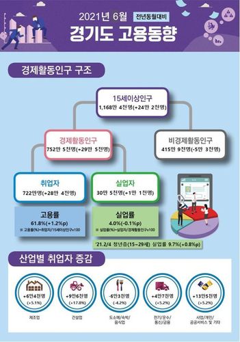 14일 경인지방통계청이 발표한 '2021년 6월 경기도 고용동향'에 보면 지난달 취업자 수는 722만명으로 1년 전보다 28만4천명(4.1%) 증가했다.