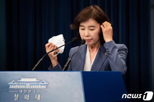 (서울=뉴스1) 유승관 기자 = 박경미 청와대 대변인이 9일 청와대 브리핑룸에서 G7 정상회의 및 유럽 2개국 국빈 방문 관련 브리핑에 앞서 마스크를 벗고 있다. 2021.6.9/뉴스1 |