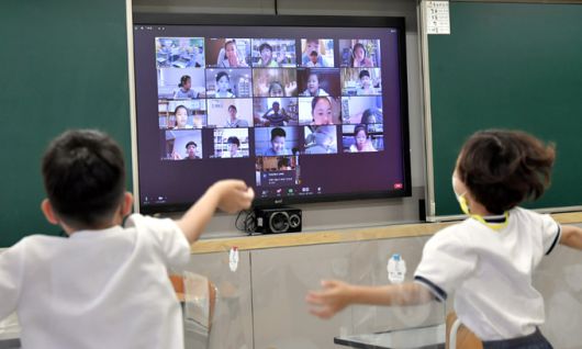코로나19 4차 유행에 따른 사회적 거리두기 4단계 격상으로 수도권 학교들이 전면 원격수업에 들어간 14일 서울 노원구 화랑초등학교 1학년 교실에서 원격수업과 대면수업에 참여 중인 학생들이 화면을 통해 인사를 나누고 있다. 교육부는 이날 유·초·중·고교 89.4%가 등교를 중단했다고 밝혔다. 하상윤 기자 ⓒ 세상을 보는 눈, 세계일보
