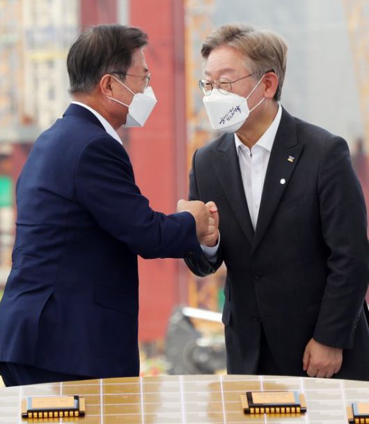 문재인 대통령과 이재명 경기도지사가 지난 5월 경기 평택시 삼성전자 평택단지 3라인 건설현장에 마련된 야외무대에서 열린 'K-반도체 전략 보고'에 참석해 '반도체 생태계 강화 연대 협력 협약식' 기념촬영 후 주먹인사를 나누고 있다. 뉴시스 제공 |