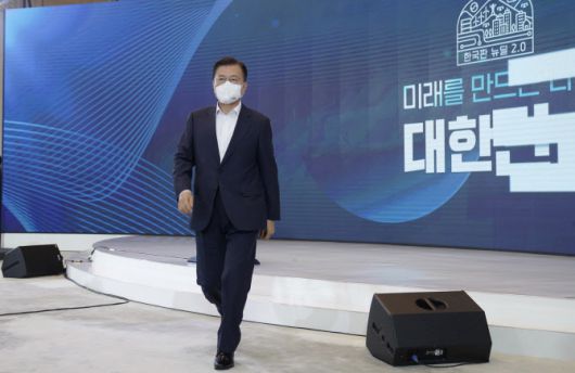 문재인 대통령이 지난 14일 오전 청와대에서 열린 제4차 한국판 뉴딜 전략회의에서 발언을 마친 뒤 단상에서 내려오고 있다. (사진=청와대 제공) |
