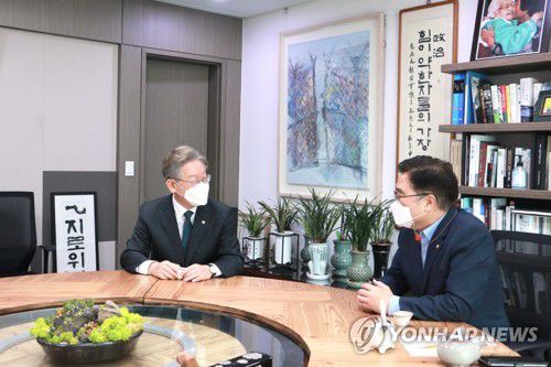 더불어민주당 대선 예비후보인 이재명 경기도지사(왼쪽)가 7월 14일 오전 국회 의원회관을 방문, 민주당 우원식 의원과 대화하고 있다. 4선인 우원식 의원은 민생 문제 해결 등을 위해 이재명 경기지사를 공식 지지하기로 했다. [이재명 캠프 제공. 재판매 및 DB금지] |