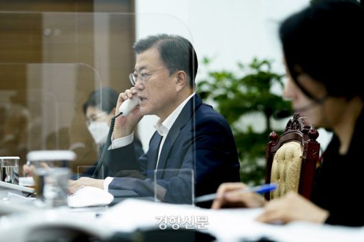 문재인 대통령이 15일 오후 청와대 여민관에서 응우옌 푸 쫑 베트남 공산당 서기장과 통화하고 있다. 청와대 제공 |