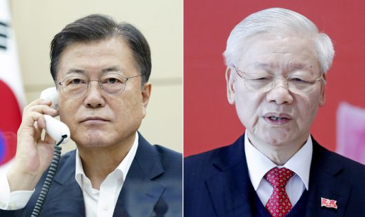 문재인 대통령은 15일 응웬 푸 쫑(Nguyen Phu Trong) 베트남 당서기장과 전화 통화를 갖고 양자관계 강화 방안, 주요 지역 및 국제 정세 등에 관해 협의했다. 문 대통령과 쫑 당서기장은 2023년까지 양국 교역액 1000억 달러 달성을 위해 긴밀히 협력하기로 했다. 청와대 박경미 대변인은 이날 양국 정상 전화 통화 후 서면브리핑을 통해 이같이 전했다. 이번 통화는 베트남 신지도부 출범 후 양국 정상급 차원에서 처음 이루어진 것것이다.