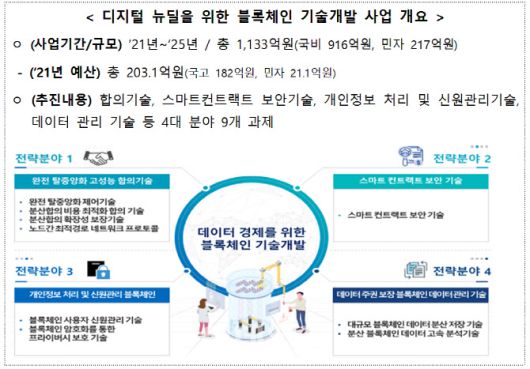 임혜숙 장관은 ‘디지털 뉴딜 종합계획’에 따라 5년간 총 1133억원을 투자하는 ‘데이터 경제를 위한 블록체인 기술개발사업’의 본격 착수를 기념하는 기술협력설명회에 참석해 관계자들을 격려한다.