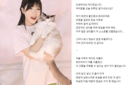 BJ에디린은 "예전에 불안증과 트라우마로 비명을 질렀던 방송 이후 카메라 앞에 설 때마다 긍정적인 생각을 하며 방송을 하려 해도 자꾸 힘든 생각들이 스스로를 괴롭혔다"며 "약을 아무리 먹어도 악플과 트라우마가 저를 괴롭혔고 이 고통을 극복할 수 없다는 생각까지 들었다"라며 우울증이 악화된 상태를 전했다.