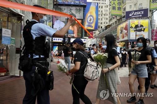 지난 2일 홍콩 코즈웨이베이에서 경찰들이 꽃을 든 남성에 대해 검문검색을 펼치는 모습. [AFP=연합뉴스] |