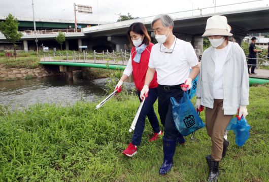 최재형 전 감사원장 부부가 17일 오전 부산 해운대구 석대사거리 동천교 인근에서 김미애 국민의힘 의원(왼쪽)과 국민의힘 해운대구을 당원협의회가 마련한 환경미화 봉사활동에 동참하고 있다. [연합] |