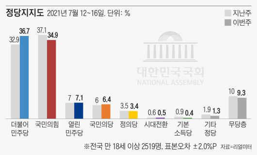 반면 국민의힘 지지율은 지난주보다 2.2%포인트 하락한 34.9%로, 지난 3월 둘째 주 집계 이후 최저치를 나타냈다.