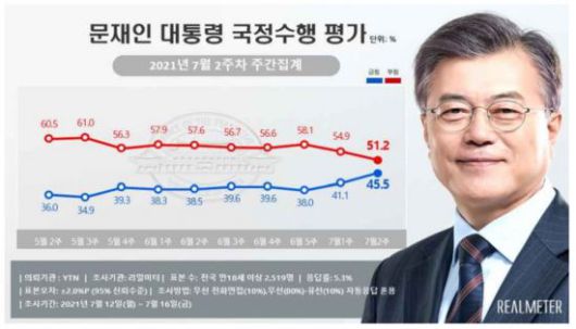 19일 리얼미터가 YTN의뢰로 지난 12일부터 16일까지 전국 18세 이상 유권자 2519명을 대상으로 실시한 조사(표본오차 95%신뢰수준에 ±2.0%포인트) 결과, 7월2주차 문 대통령의 국정 수행 긍정평가는 45.5%(매우 잘함 27.6%, 잘하는 편 17.9%)로 나타났다. 이는 전주대비 4.4%포인트 오른 수치로, 지난해 10월3주차 45.6%를 기록한 이후 최고치다.