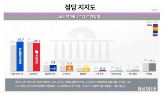 민주당 지지율은 지난주보다 3.8%포인트 오른 36.7%로 집계됐다. 이는 지난해 9월1주차(37.8%) 이후 최고치로, 20주 만에 오차범위 안에서 국민의힘에 앞섰다. 국민의힘은 올 3월2주차(32.4%) 이후 최저치를 보이며 전주대비 2.2%포인트 하락한 34.9%를 기록했다.