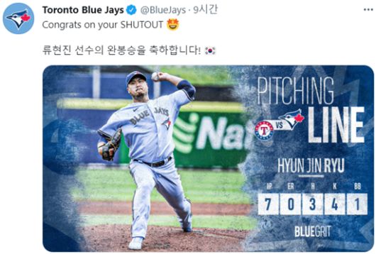 (엑스포츠뉴스 박윤서 기자) 토론토 블루제이스가 '에이스' 류현진(34)의 완봉승을 축하했다.