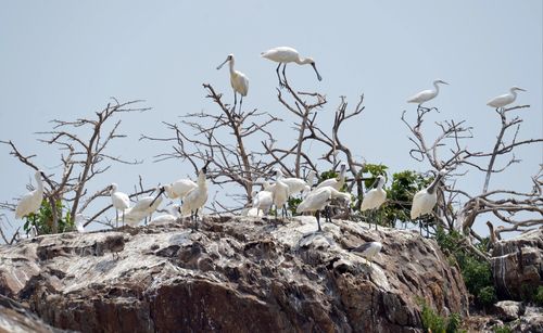 서천 노루섬의 저어새(가운데)와 노랑부리백로(오른쪽 나무 위) |