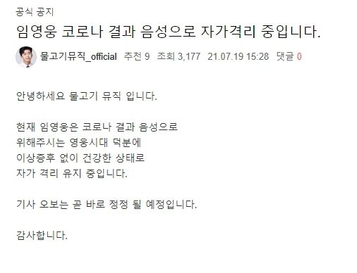▲ 이하 임영웅 코로나 19 검사 결과 관련 소속사 물고기 뮤직 SNS 전문