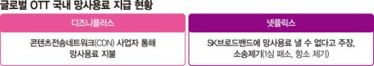 넷플릭스는 SK브로드밴드에 소송까지 불사하며 망사용료를 지급할 수 없다는 입장인 반면 디즈니 플러스는 콘텐츠전송네트워크(CDN) 사업자를 통해 간접 방식으로 국내 통신사에 망사용료를 지급할 예정이다.
