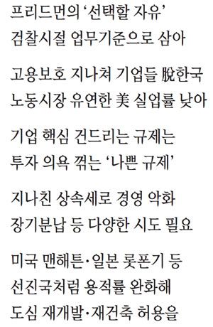 ▷기업이 일자리를 만들게 해줘야 하는데 우리나라는 고용 보호가 지나치다. 그러니 자꾸 해외로 나가려고만 한다. 미국은 민권법상 위배 조치만 없다면 해고가 자유롭다. 언제든 해고할 수 있되, 해고 과정에서 부당한 차별이 있었다면 엄청난 액수의 손해배상을 인정해준다. 우리나라에서 그렇게까지 하자는 것은 아니다. 회사 생존에 문제가 생길 정도로 어려운 상황에 처했다거나, 회사가 수익구조 개편을 위해 기존 사업을 정리하고 새로운 사업부를 만든다거나 할 때는 해고나 조기 퇴직 프로그램을 가동할 수 있게 해줘야 한다. 이 정도 노동유연성만 확보해도 기업이 훨씬 사업하기 좋아지고, 더 많은 일자리를 만들 수 있을 것이다. 정부가 지금처럼 나서서 혁신하지 않아도 알아서 혁신이 된다.