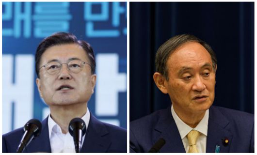 문재인(왼쪽) 대통령과 스가 요시히데(菅義偉) 일본 총리. [연합, 로이터] |
