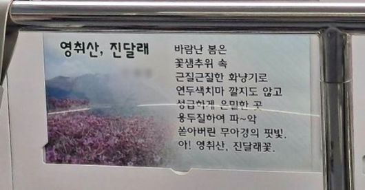 지난 19일 오후 5시쯤 광주 지하철 1호선 열차 안에서 다섯 살배기 여자아이가 우렁찬 목소리로 열차 안에 부착된 시 한 편을 따라 읽었다.