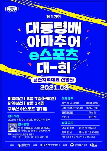 ▲ 부산정보산업진흥원은 제13회 대통령배 아마추어 e스포츠 대회에 참가할 부산지역 대표 선발전을 내달 온·오프라인으로 개최한다. 선발전에서 뽑힌 13명은 오는 10월 창원에서 열리는 전국 결선에 출전한다. 단체전 1위(리그오브레전드, 배틀그라운드 모바일)와 개인전 종목별 1, 2위(카트라이더, 클럽오디션)에게 출전 자격이 주어진다. 선발전에 출전하려면 내달 3일까지 브레나 공식홈페이지(www.brena.or.kr)에서 신청하면 된다. (부산=연합뉴스)