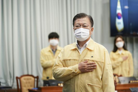 문재인 대통령이 20일 오전 청와대에서 열린 영상 국무회의에서 국기에 경례하고 있다.(사진=청와대 제공) |