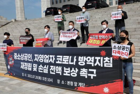 하태경, 최승재 의원 등 국민의힘 의원들이 20일 서울 여의도 국회 본청 앞에서 기자회견을 열고, 중소상공인과 자영업자를 대상으로 한 신종 코로나바이러스 감염증(코로나19) 방역지침 재정립과 전액 손실보상을 촉구하고 있다. 사진=박범준 기자 |