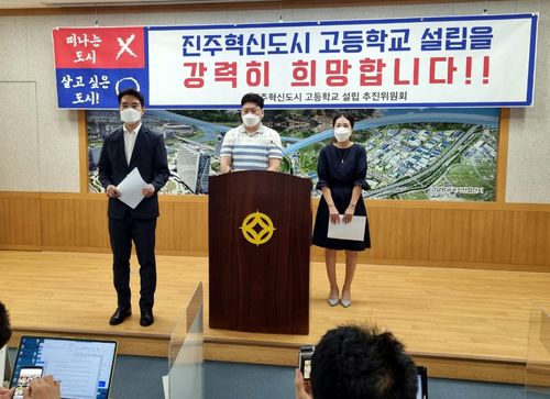 (진주=연합뉴스) 지성호 기자 = 경남 '진주혁신도시 고등학교 설립추진위원회(이하 추진위)'가 20일 진주시청 브리핑룸에서 출범 기자회견을 열고 고등학교 추가 설립을 요구했다.