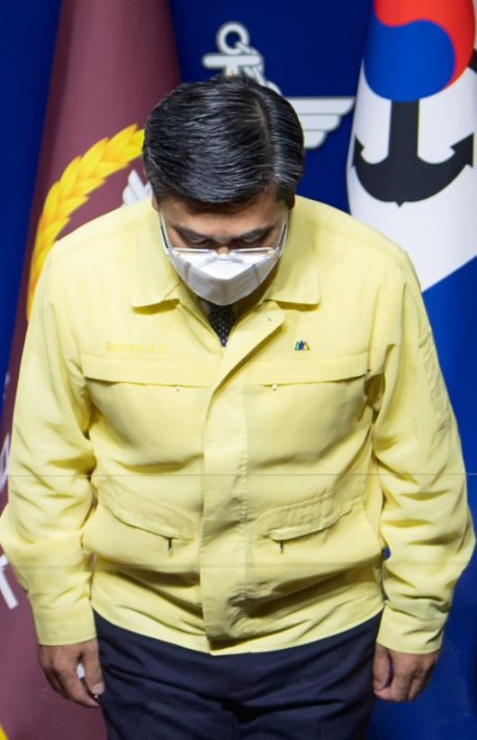 서욱 국방부 장관이 20일 서울 이태원로 국방부 브리핑룸에서 청해부대 34진 코로나19 집단감염 사태와 관련, 기자회견을 열고 대국민 사과를 한 뒤 고개를 숙이고 있다. 국방부 제공 |
